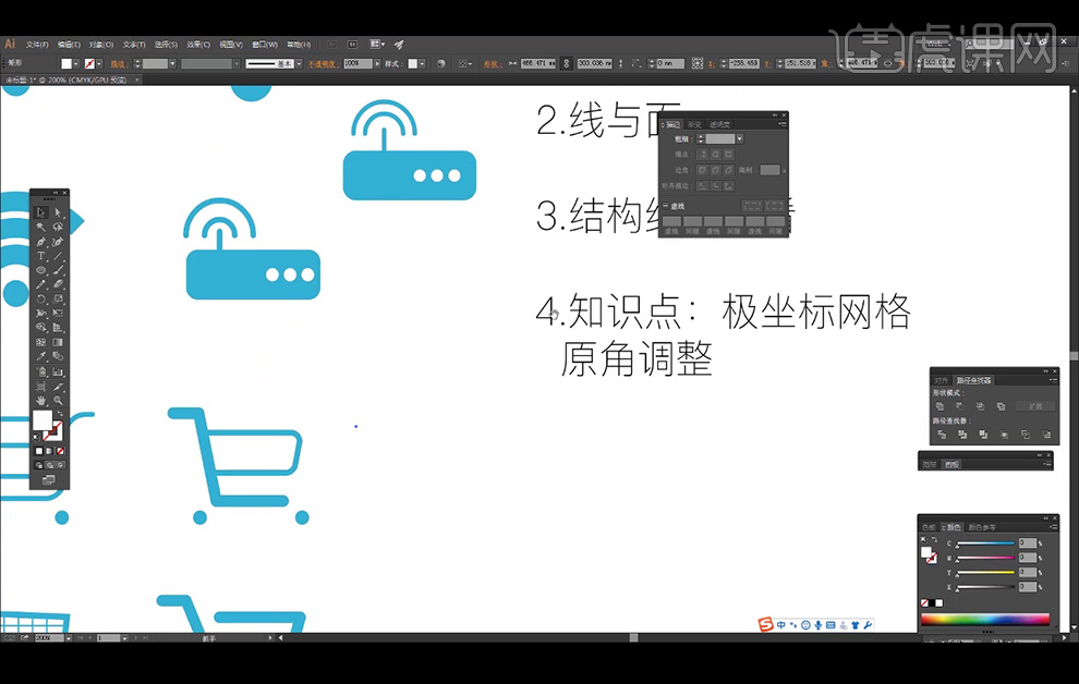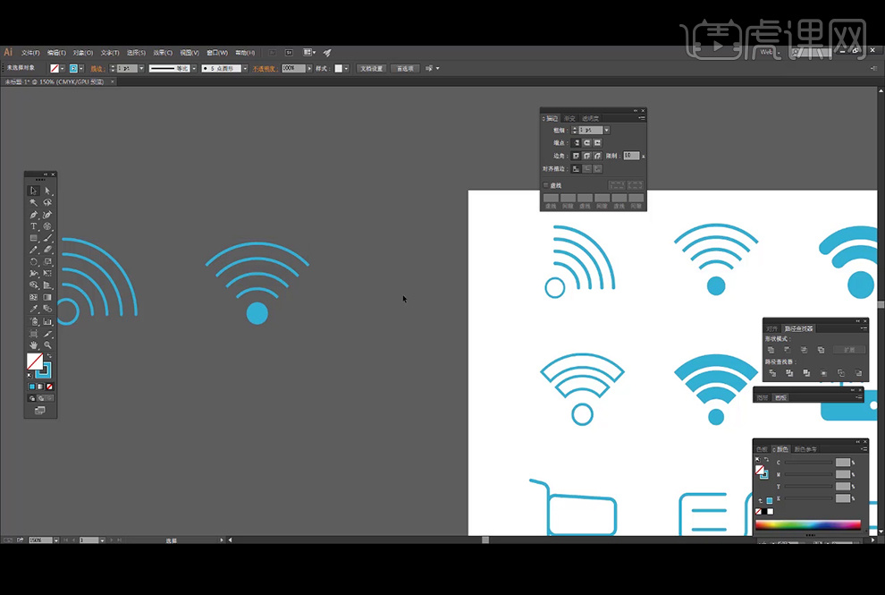 利用【椭圆东西】绘制两个轮子。14、利用【钢笔东西】绘制线条,4、选中弧形显的,点击【径查找器】中的减去顶层,按【Delete】删除,先选择底部的圆形,然后再对图标进行描边上色等等一系列操做过程,将端点改为【圆形端点】。